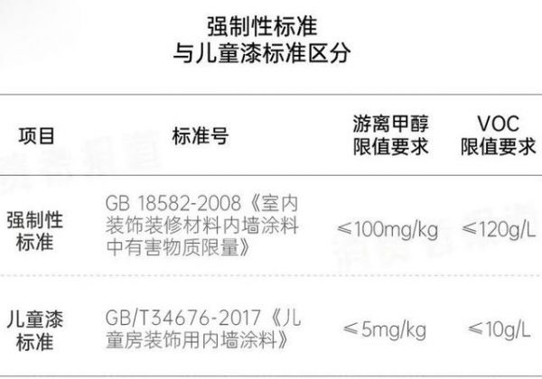 而普通的乳胶漆只需要符合强制性国家标准,游离甲醛应≤ 100mg/kg,VOC应≤120 g/L即可,单从这2项指标来看,儿童漆标准比普通乳胶标准严格10倍以上!