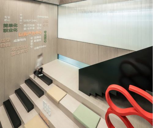 位于中庭的大阶梯做为办公人员步行上下主要动线,同时也提供了阅读休息的空间,即是交通动线,又赋予了沟通交流开会发布等功能,还是企业文化展示的重要空间。