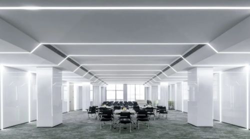 通过审视空间条件,思考空间顶部及整体标高的设计.结合现场复杂的梁归纳设备贴梁走管,形成不规则方块形。通过发光膜模拟天光效果,营造沐浴“阳光”下办公空间氛围感。