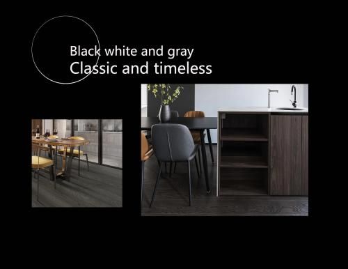 客厅以黑白灰为基调,灰色的背景墙面,多了几分轻奢风的味道。黑色的皮质沙发,一字型电视柜,简洁大方;地面采用金钢铂林爱沙尼亚的单拼拉维灰橡1+1三层实木木地板,表面超超超超哑光特殊处理,形成黑白灰对比,给人以强烈的视觉冲击力。