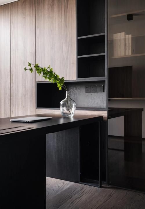 以低调、柔和的灰色木地板与木质收纳柜,中和餐厅硬朗气质,打造出丰富的层次感,更显高级感。大面积的玻璃,让室内外有更多的呼应,将光与景引入室内,加强视觉上的通透感。