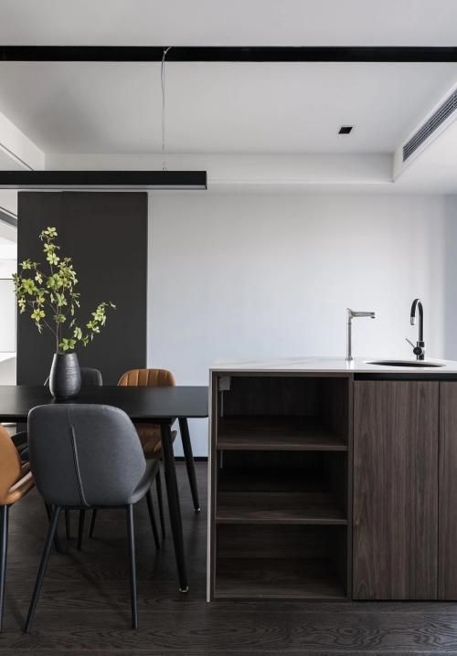 餐厅的装修风格和客厅基本一致,黑色大理石的餐桌,用皮质纯色的餐椅和绿植勾勒餐厅温柔底色,黑色边框线条、大面积白色墙面,简洁而又高级。