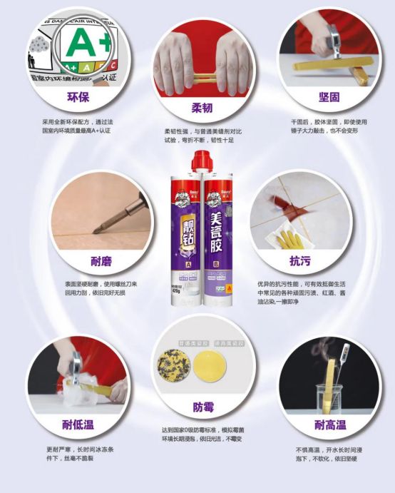 德高靓钻美瓷胶是由环氧树脂聚合物研制而成,在色泽、柔韧性、耐污性方面,优势明显,弥补了水泥基填缝料在色泽、耐污性等方面的缺陷。