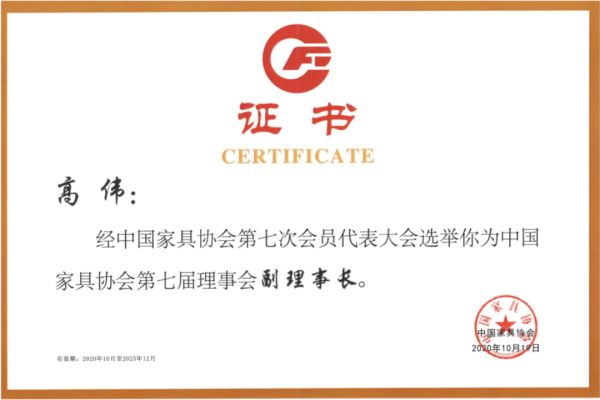 在此选举中,亚振家居当选为中国家具协会第七届理事会副理事长单位,亚振家居董事长高伟当选为中国家具协会第七届理事会副理事长。