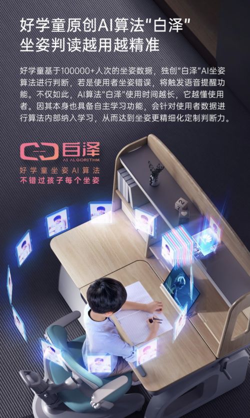 为什么说其他智能学习桌不是真正的智能学习桌呢,因为它们没有学习能力。但好学童AI智能学习桌不一样,它自带“大脑”———好学童研发团队独创的坐姿AI算法“白泽”,可以自己学习和思考。