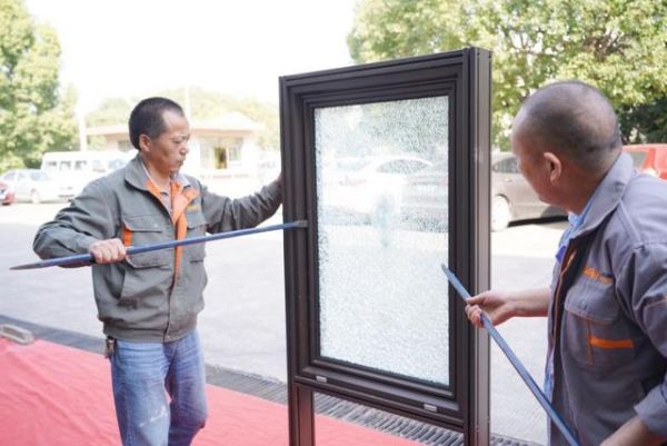 为了检验中空钢化玻璃的稳固性,现场还进行了暴力的砸窗的测试。令品鉴团嗔目结舌的是,在好几个壮汉的"千锤百炼"之下,玻璃出现裂痕,碎片却仍稳固不脱落。这极大地确保了门窗的安全和防盗性能。