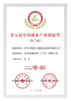 第五届中国林业产业创新奖(木门业)最高奖项为二等奖,安必安荣获此届最高殊荣。