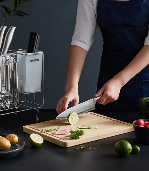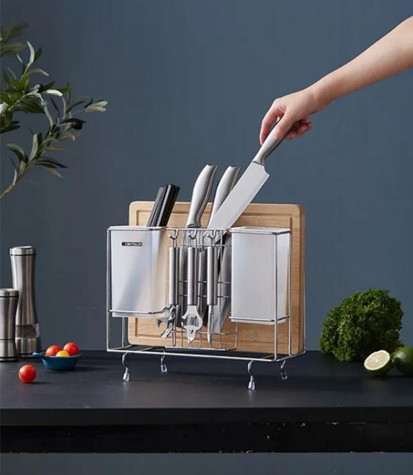 乐厨置物架看似体积不大,形态简单,仅为0.0023立方米左右,但其肚量却能出乎大多数人的意料,最少能装下:厨刀一套(三把)+厨用工具一套(三把)+筷子(最少十双)+菜板(一块),而且,凭借我们所预留的空间,如果你打算在此基础上多放一些厨具,也完全可以。