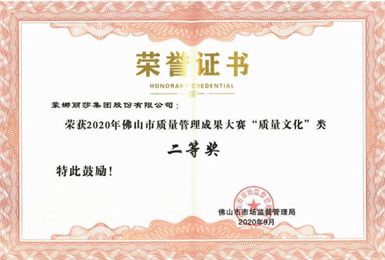 会上,佛山市许国副市长、市市场监管局党组成员任伟青总工程师分别做了重要讲话,并为获得2020年佛山市质量管理成果大赛优秀案例(质量班组类、质量文化类、质量共治类)的企业颁发奖杯和荣誉证书,蒙娜丽莎集团以《“三美”模式持续优化》的成功案例在此次质量管理成果大赛质量文化类中荣获二等奖。