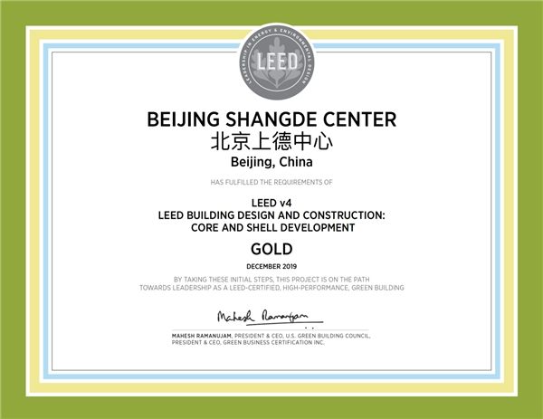 上德中心获得绿色建筑评价体系LEED金级行业认证