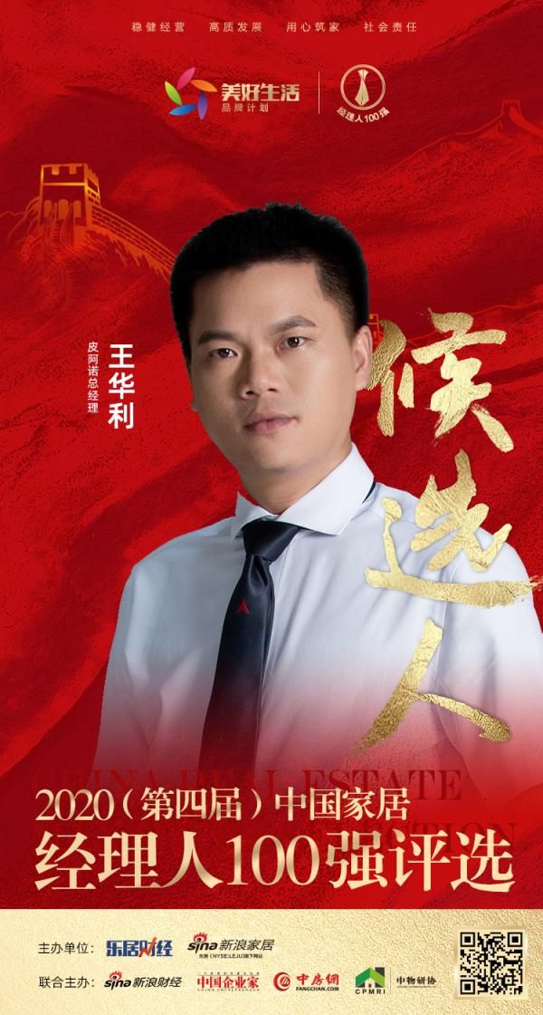 新浪家居讯 由乐居财经、新浪家居主办,新浪财经、中国企业家、中房网、中物研协联合主办的“行稳致远——2020(第四届)中国家居经理人评选”网络报名正式启动。10月27日,皮阿诺总经理王华利先生获提名,成为“2020中国家居经理人100强”候选人。