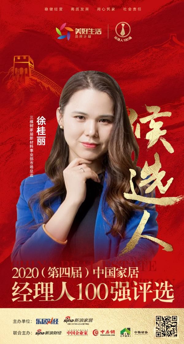 新浪家居讯 由乐居财经、新浪家居主办,新浪财经、中国企业家、中房网、中物研协联合主办的“行稳致远——2020(第四届)中国家居经理人评选”网络报名正式启动。10月27日,三棵树家居新材料事业部市场总监徐桂丽女士获提名,成为“2020中国家居经理人100强”候选人。