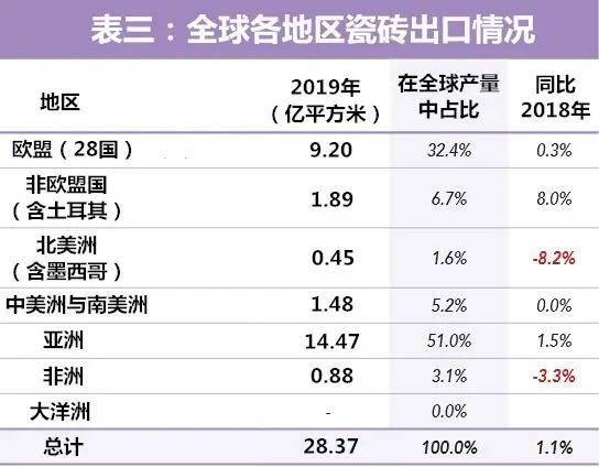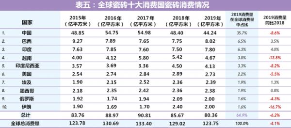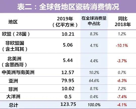 全球瓷砖消费减少5亿㎡,非洲增长7.2%报告还显示,2019年全球瓷砖消费量从129.02亿㎡减至123.75亿㎡,减少了约5亿㎡,下降了4.1%。其中: