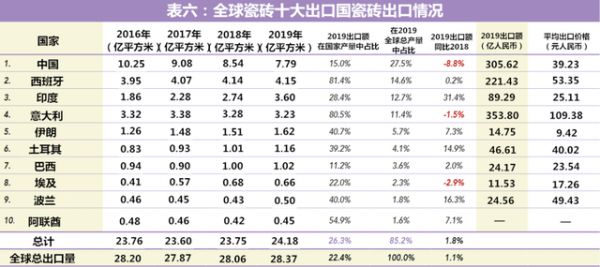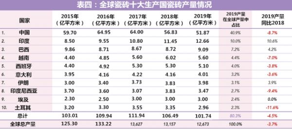 产量方面,2019年中国瓷砖产量下降8.7%,仍占全球总产量的40.9%;意大利和西班牙产量均下降3.8%;越南下降7%;印度尼西亚下降9.4%;土耳其产量下降11.6%;美国下降4.6%。而印度产量增长10.6%;巴西产量增长4.2%;伊朗瓷砖产量则增长3.9%。