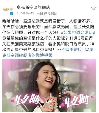 当前,奥克斯空调#如果空调会说话#微博互动活动正在火热进行中。看过趣味街头采访视频片段后,有兴趣分享自身特别想法的消费者前往“奥克斯空调旗舰店”和“AUX奥克斯空调”微博转发、评论区积极参与互动,即有机会成为锦鲤,赢取11月3日脱口秀直播门票、神秘明星签名好物或实用家电好礼,提前乐享双十一惊喜!。