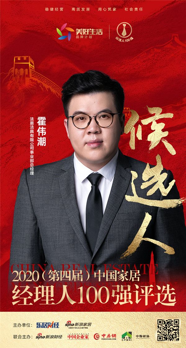 新浪家居讯 由乐居财经、新浪家居主办,新浪财经、中国企业家、中房网、中物研协联合主办的“行稳致远——2020(第四届)中国家居经理人评选”网络报名正式启动。10月29日,佛山市法恩洁具有限公司事业部总经理霍伟潮获提名,成为“2020中国家居经理人100强”候选人。