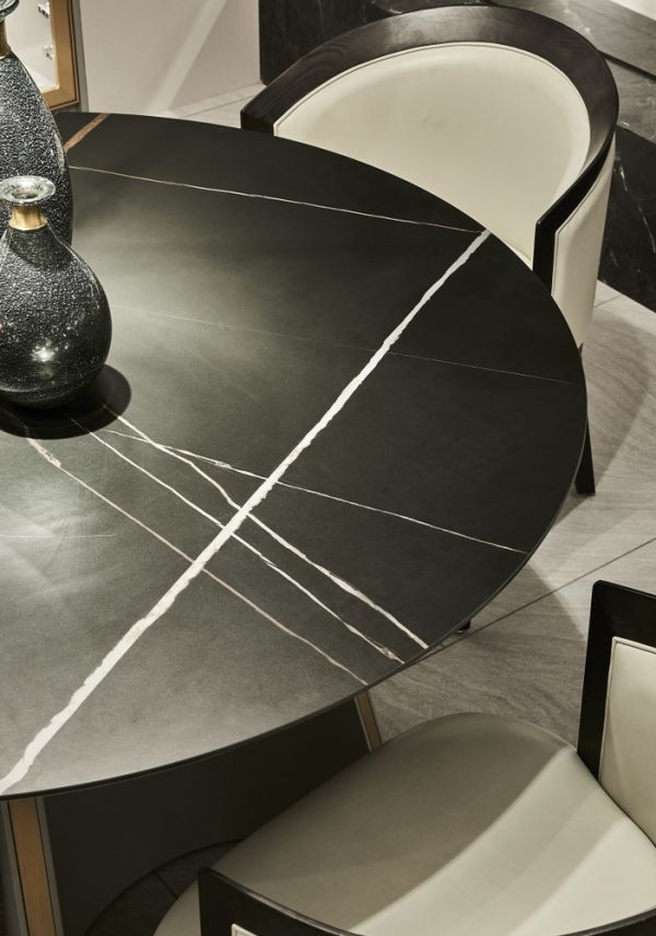城市之窗慕弗014圆形餐台,以圆形为基础设计图形,在台面以及脚的造型上采用圆形构造,从而形成完美的整体效果,传达对生活圆满、美好的愿景。底部使用圆弧承重脚结构,中间镶嵌不锈钢金属,台面由劳伦特黑(白)金岩板制成,在满足实用性的同时增强装饰效果,让餐台更具美感。