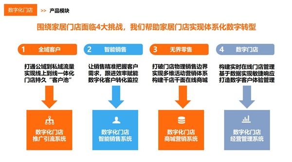 惟客数据针对家居门店当前面临的推广获客难、销售跟进难、零售交易难、经营管理难四大挑战,设计了体系化的数字转型方案,包括了数字化门店推广引流系统,打通公域到私域流量,实现线上到线一体化门店持久“客户池”;数字化门店智能销售系统,让销售精准把握客户需求,跟进效率赋能数字化客户转化监控;数字化门店商城营销系统,打破门店物理销售边界,实现多维活动营销体系,构建千店千面在线商城;数字化门店经营管理系统,构建实时在线门店管理,基于数据实现敏捷响应,打造数字客户体验管理。