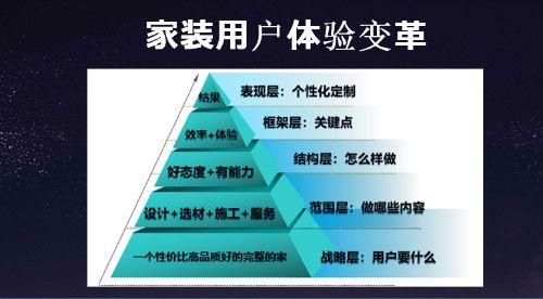 这个是家装行业第一次运用用户体验的五元素,其他行业用的非常广泛,至少在家装行业没有人玩这个模型,这个对应到家装行业,我试着写了这样一个版本,第一个是战略层,用户要什么,一个性价比高,品质好的完整的家。第二个要做哪些内容呢?设计,施工,材料服务,这个就不延展了。怎么去做呢?非常难。做好设计,施工,选材是装修公司该做的,我们是不是有这样一个好态度。关键点是提升我们的效率、人效品效,我们的体验度特别好。随后出现的是一个个性化的家。