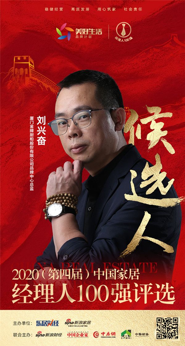 新浪家居讯 由乐居财经、新浪家居主办,新浪财经、中国企业家、中房网、中物研协联合主办的“行稳致远——2020(第四届)中国家居经理人评选”网络报名正式启动。10月29日,厦门金牌厨柜股份有限公司品牌中心总监刘兴奋获提名,成为“2020中国家居经理人100强”候选人。