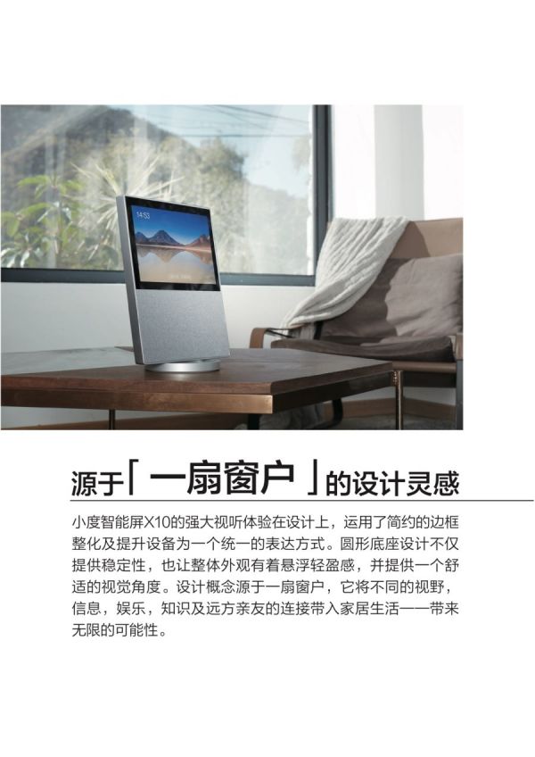除了创新设计,整体外观更是“独具匠心”。其正面黄金比例设计,更加凸显出产品10.1英寸的超大屏幕,为家居环境带来无限想象空间。正如小度智能屏X10主创设计师介绍,小度智能屏X10的设计概念源于一扇窗户,它将不同的视野、信息、娱乐、知识及远方亲友的连接带入家居生活,“带来无限的可能性”。