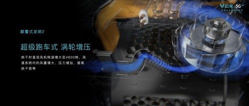 颠覆式发明2:超级跑车式涡轮增压。烘⼲时直流风机转速增⼤⾄4600转,风道系统内的风量增⼤、压⼒增加,烘⼲效率更⾼。