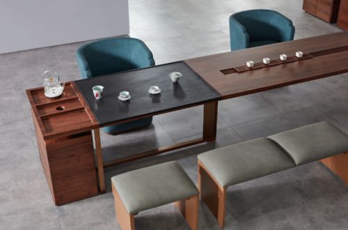 在洗尽铅华后的安静空间里,三五好友的相聚时间仿佛是都市人群最奢侈的享受。茶香四溢必然将搭配形式感极强的茶家具。