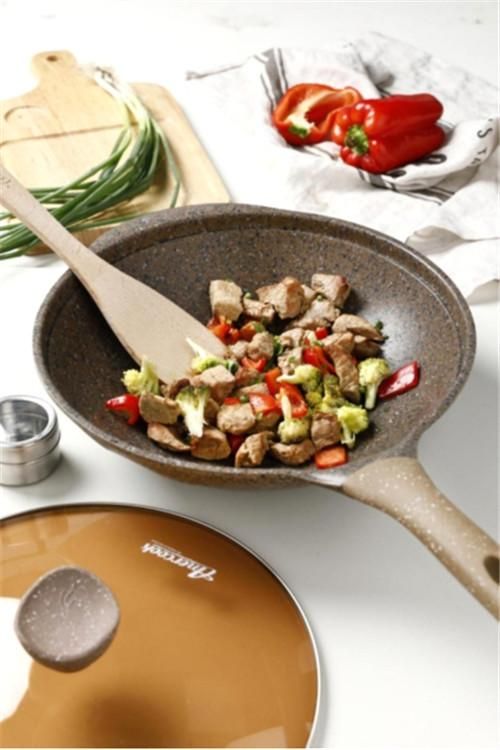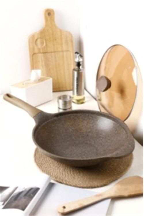 这款炒锅蛮轻的,对比我家里之前的一个不锈钢炒锅,轻了好多。我拿在手里颠一颠,感觉完全可以在炒菜的时候拿来颠勺,相当完美!至于外表,这个锅颜值很不错,花岗岩外表给人一种很结实耐用的感觉,锅盖是透明的,锅的手柄是电胶防滑的,摸起来有点磨砂那样温柔的感觉,但完成承受得起锅的重量,整个搭配起来很有一种北欧风气质。