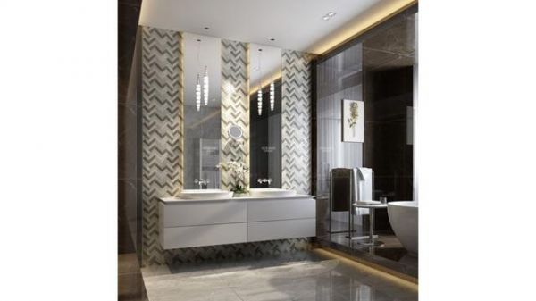 马赛克本身就具有很强的艺术装饰效果,譬如这个案例就使用了几何设计的马赛克作为盥洗台背景墙,线条化的马赛克花纹,为整个空间增添了繁复的动感,更显个性。
