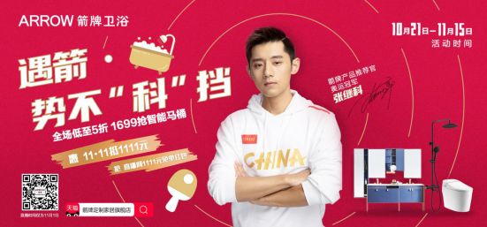 2020年11月1日,张继科将现身箭牌直播间,开启全网直播。张继科不仅将在直播中送上11.11抵1111优惠、1111免单红包,更将与箭牌卫浴在直播间开展冠军的BATTLE,分享冠军品质、生活智慧,并一同感受全球智慧家居大家的设计智慧、人文智慧和制造智慧。据悉双十一狂欢购活动将从10月21日持续到11月15日,当张继科“遇箭”箭牌卫浴,一切将势不“科”挡。