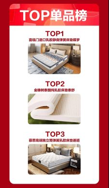 天猫TOP1:天猫住宅家具类目单品第一、床垫类目单品第一,单品破床垫单日销售历史记录!
