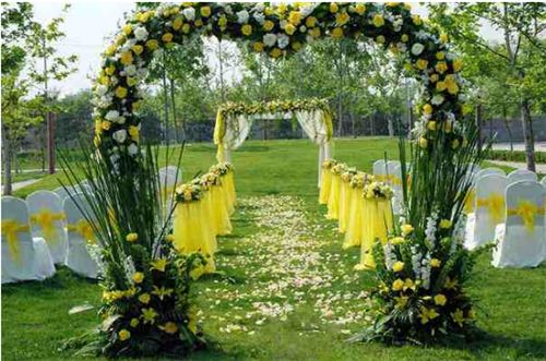 1、可以在院子的草地上设置一个结婚拱门,在用一些小花进行装扮,从拱门处开始,使用一些百合花瓣,玫瑰花瓣铺设一条让新人进场的花瓣路,一直延伸到舞台。在花瓣路的两旁摆上婚礼来宾的座椅,在每个座椅上绑上一支粉色玫瑰,这样让整个院子的布置可以在花的贯穿下,非常简单而又优雅。