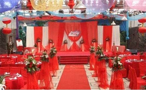 3、如果想要喜庆的婚礼,大部分人都会选择使用一些红色的物品进行布置。可以在院子中间设计一个红色的背景舞台,在舞台上进场的地方使用花朵与搭建一个亭子这个更显的非常浪漫,而在舞台的两边还可以摆上一些红色的座椅这样显的非常喜庆,布置出这样的院子非常适合一些中式婚礼现场。