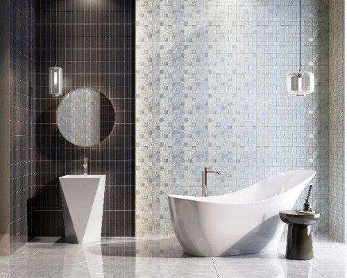 混合材质的马赛克具有极强的环境渲染力,大片铺贴可以轻松做出艺术背景墙的效果,而且其丰富的花纹、光泽变化,能够在保持简约的基调下增强层次感。