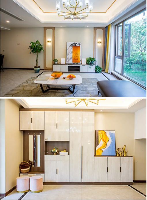 在空间上,客厅与餐厅相互独立又融为一体,暖黄色的装饰在空间上遥相呼应,空间通透使得视野宽阔,显现出空间的高级与精致。