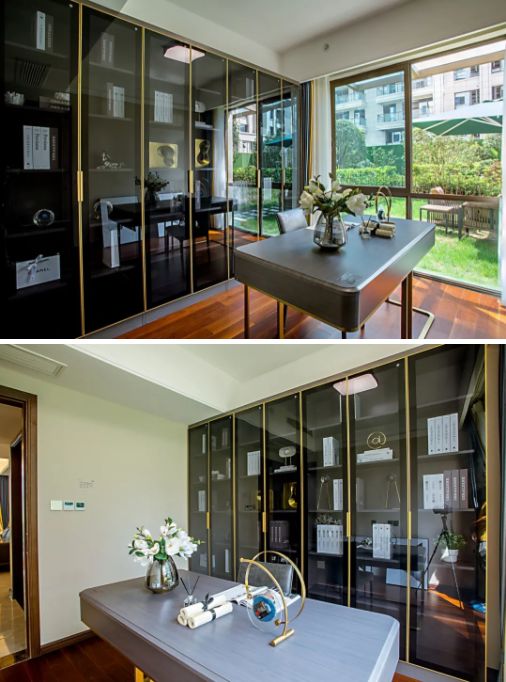 通透的空间设计,绿植花束的装点,模糊了室内与室外的界限,使得书房少了刻板多了清新,在繁忙或者疲倦之余,能一眼望进室外的自然风景,舒适而享受。