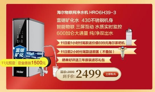 在产品的选择上,针对于此前用户加购较多的海尔物联网厨房净水器钢锶侠HRO6H39-3这款产品,推出了11元预约立减1500元的大额优惠。针对会员复购滤芯,推出7-9折的超低优惠。