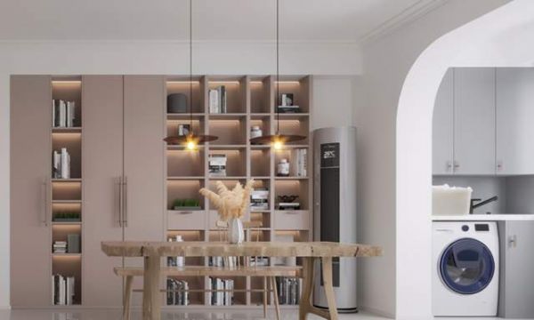 现在的年轻人大多都不和老人同住,又加上考虑到小朋友的用眼健康,不希望他们过早地接触到电视,这样一来,客厅就很适合投影仪了。将沙发、茶几换成大书桌,这样一来,书桌就能立马成为空间的中心,然后紧接着就能搞一面书柜墙,看着还是很有味道的。所以客厅摇身一变成了可以阅读、办公、会客、写作业的高效多用途客厅莫样,大人工作陪孩子一起读书学习,言传身教效率更高,效果也会更好。