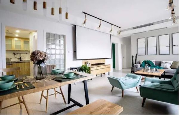 另一面墙留白,用来安装幕布,投影仪取代电视,一家人周末一起看电影放松~岂不是美滋滋。说实话大部分人已经无法正儿八经的看电视了,大多数时候电视也只是背景音乐一样的存在,投影仪就成了当代家庭必备的单品了。