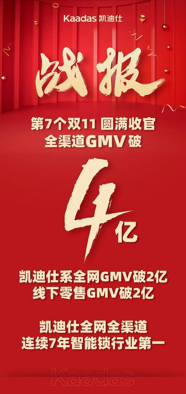 近日,双11全球狂欢盛宴终于落下帷幕,历经二十多天的混战,智能锁行业领军品牌凯迪仕全渠道GMV破4亿,天猫单店成交破亿,线上同比去年增长336%,问鼎行业销冠宝座。线下零售GMV破2亿,1800+城市全面覆盖,双11期间进驻物业小区30000+,同步呈现指数级增长。全网全渠道连续7年智能锁行业第一,凯迪仕以断层式优势再次书写行业奇迹,品牌势能强势爆发。