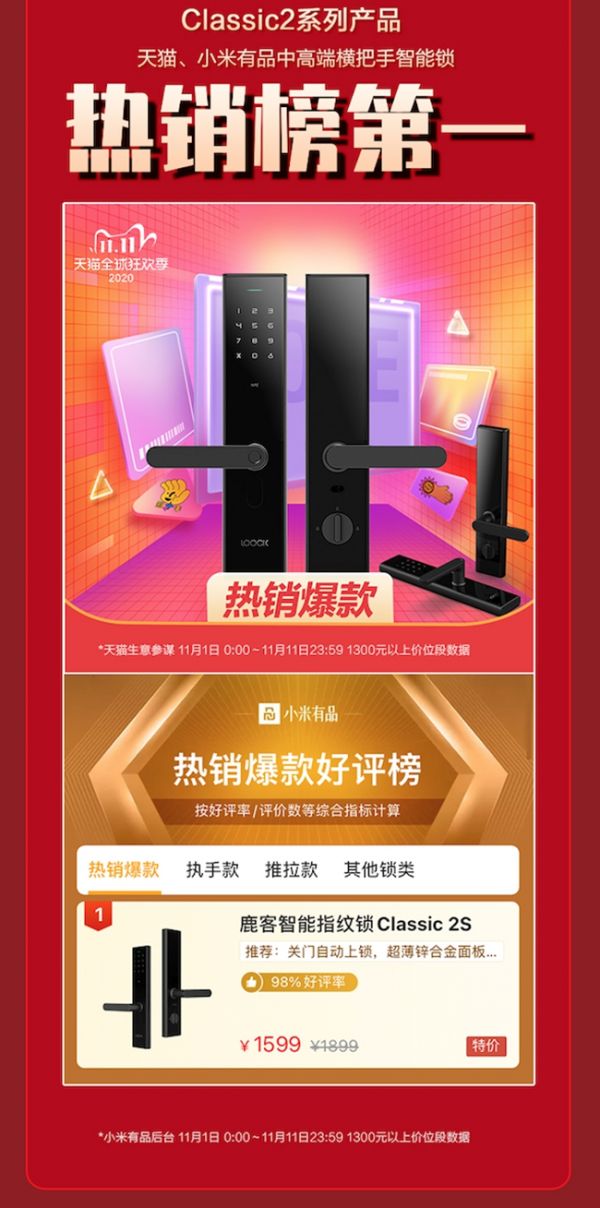 鹿客的经典热销款Classic2系列也依然深受消费者喜爱,在双11期间,拿下天猫平台和小米有品中高端横把手智能锁的热销榜第一。鹿客通过S30和Classc2两大系列产品分别在推拉款和横把手款细分品类中的优秀表现,夯实了中高端的定位,成为中高端智能锁的消费者宠儿。