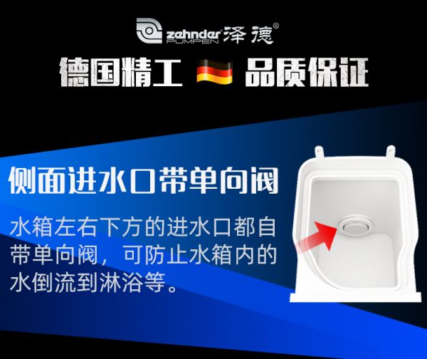 有些用户在使用提升器时,可能会担心马桶的废水从提升器溢流出来。Gerios率先在行业内,对侧面进水口设置了单向阀。位于集水箱左右下方的进水口都自带内置单向阀,可以有效防止集水箱里的污水回流到淋浴间等。