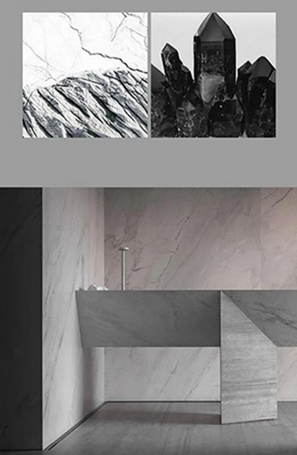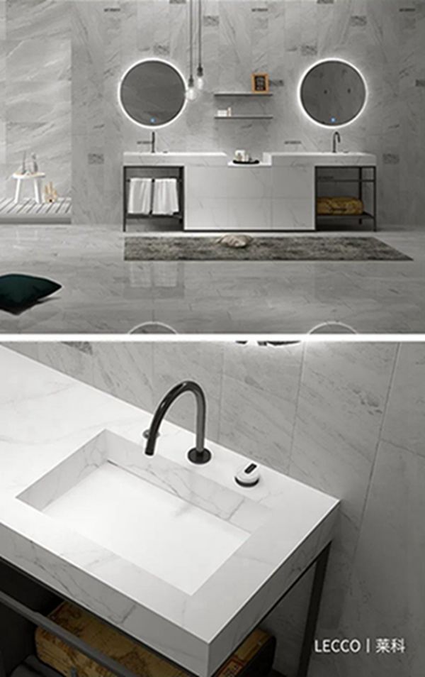 台面一体盆及柜面均由意大利超薄雪花白纹理岩板制作而成,搭配太空铝框架,十足设计感及超高的颜值让卫浴空间变得与众不同。