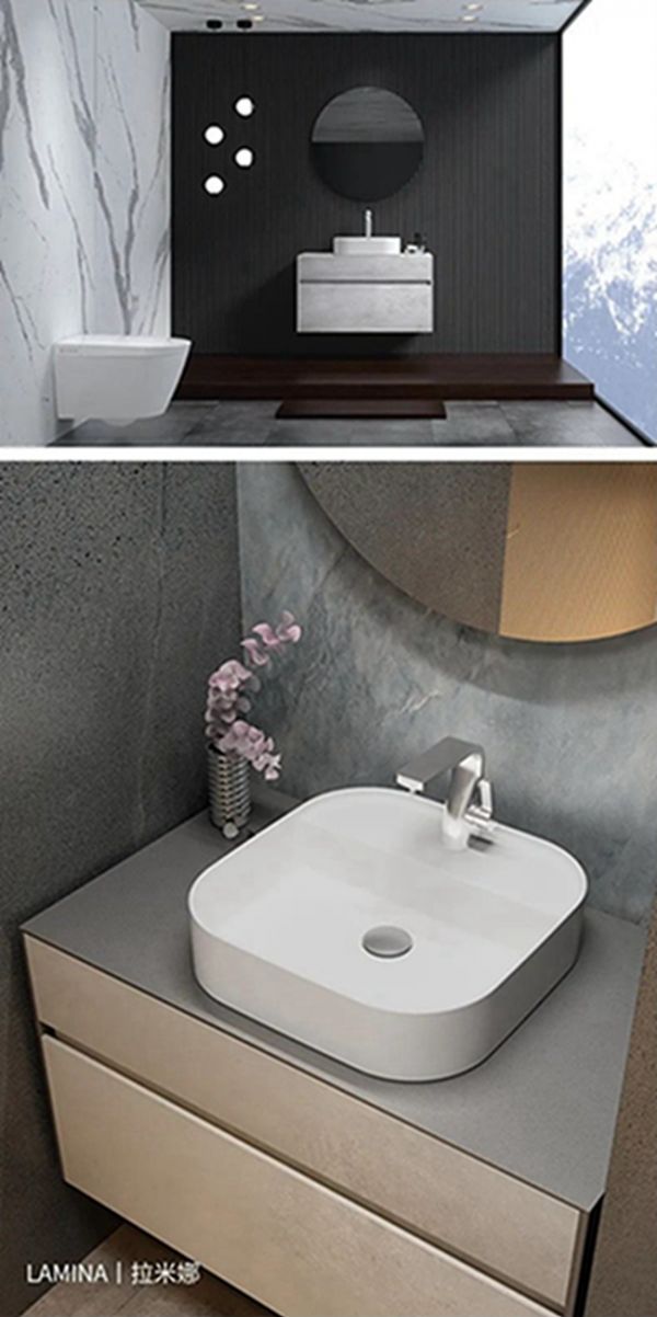 样式丰富的岩板台面与艺术感极佳的台上盆是完美搭档,配以时尚的挂墙式柜体,立于室中,犹如一幅立体艺术佳作。且台上盆具有易于修理、方便换取的优点,所以这款样式是精致控、细节控的不二之选。