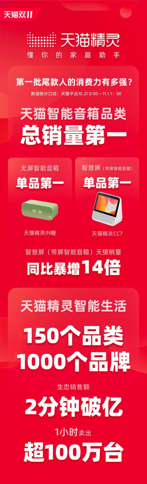 11月1日0点,天猫双11抢先购正式开幕。天猫精灵数据显示,仅仅用了2分钟,智能家居生态销售额破亿,1小时卖出了超过100万台智能家居设备。截止11日凌晨1点,天猫精灵智能音箱品类天猫平台总销量第一,其中智慧屏产品总销量同比暴增14倍,一款7寸屏新品取得单品第一。