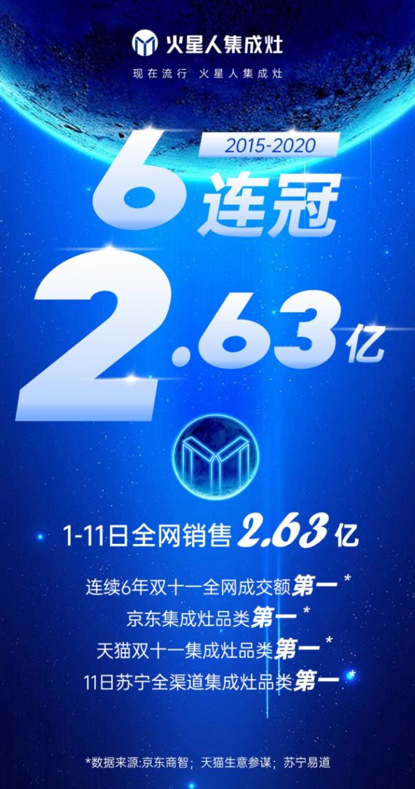2020年双十一,火星人集成灶以2.63亿+的全网销量,稳坐集成灶亿级电商俱乐部的头把交椅。