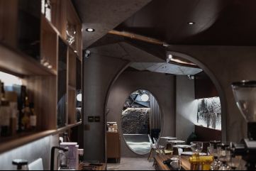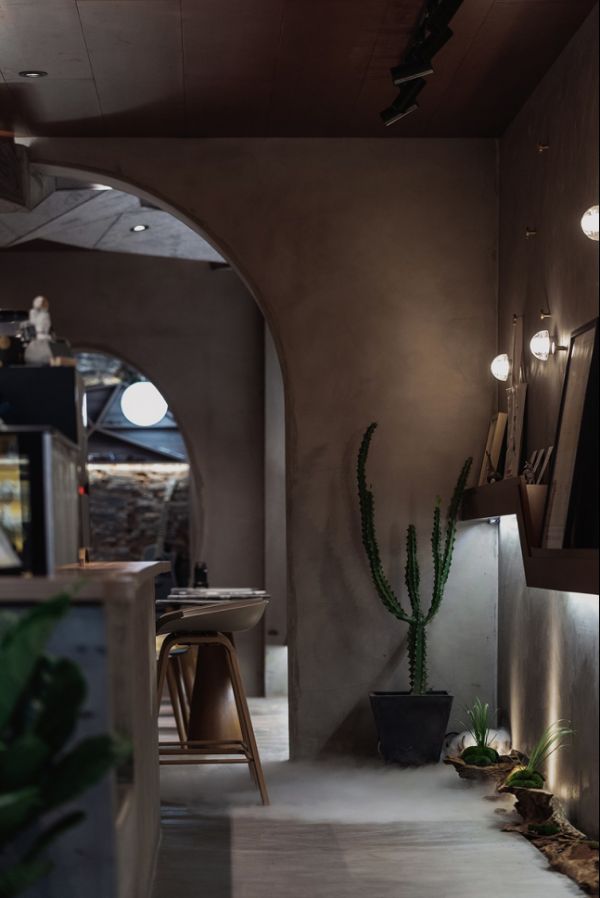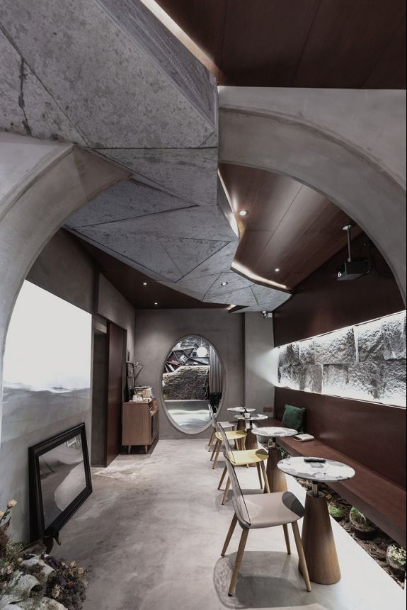 在用户体验互动区域,深棕色和浅灰色元素的相互碰撞,让空间的立体感,显得更为明显。在这神奇的避世空间,拱门和椭圆形洞口分隔空间,用水泥板模拟岩石形成了一条悬浮于空中的天路,这头顶的浅灰色甬道似乎在指引你向更深邃之处探索,你可以在原地等待,也可以顺着它前进的方向,走过去,到达“山海”的隐秘角落,探寻它的秘密。