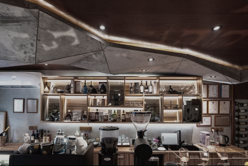 在山海咖啡馆里,设计师采用最简单的最环保的材料来解决装饰,在整体空间墙体的的处理上,墙体顶部采用装置艺术手法,用水泥板模拟岩石形成了一条悬浮于空中的天路,像山石汇聚,曲折盘旋,打造出冲突感极强的立体空间,在这里,空间似乎是无限的,并无限延长。