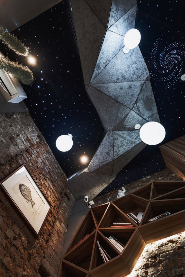 当你终于抵达在“山海”空间的最后一段旅程,设计师将这几乎无采光的尽头空间,设计成一个庭院,拆除之前保留的墙面装饰物后,裸露出的是近百年历史的斑驳砖墙,这些都已无须再做过多的修饰,亦能感触到时间的味道,顺着极其富有原生感的墙壁仰望,头顶便是星河...
