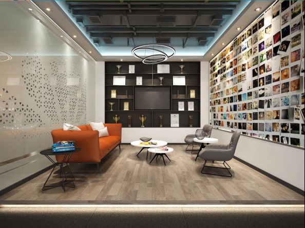 流畅的线条,亚麻、褐棕、浅灰,粗细不一,呈现一种现代感的速度美。地板与天花板相互辉映,视线引导的终点就是象征着力量的标志。点汇线、线聚面,自然的分成一个个功能区。
